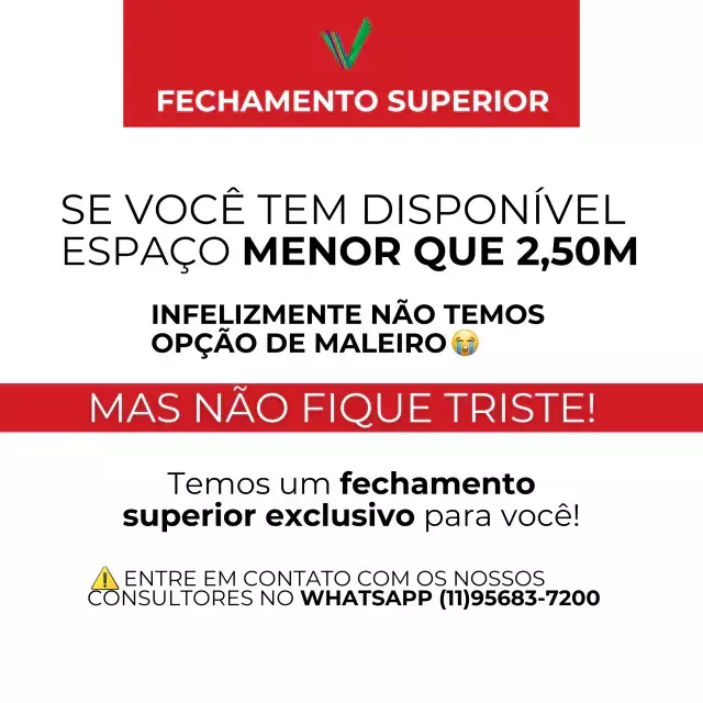 | Altura | Três opções sendo de: 0,30cm,0,40cm e 0,50cm. Escolha de acordo com o seu espaço disponível com o fechamento até o teto. |