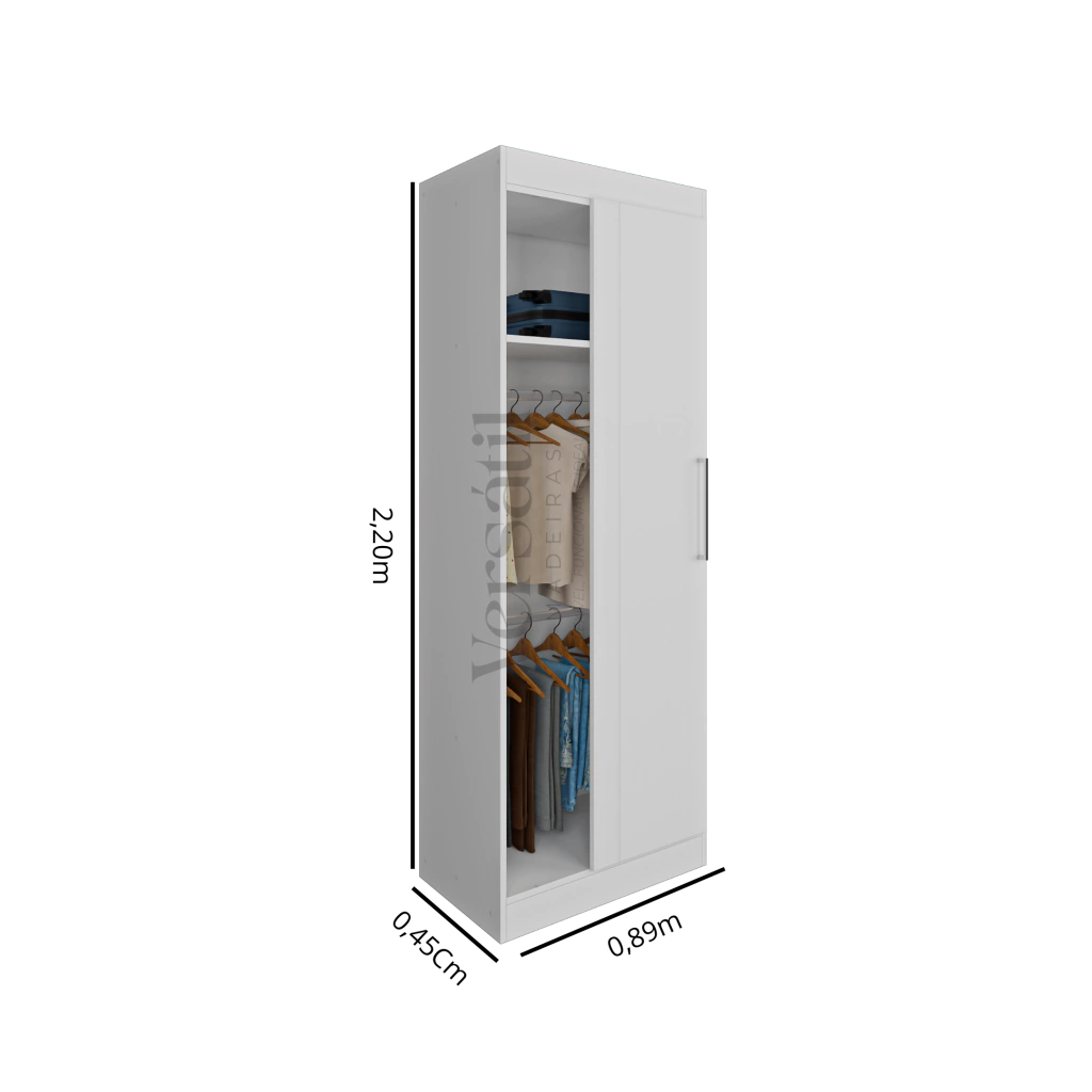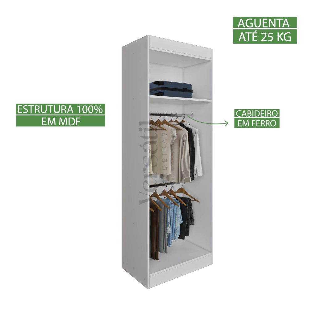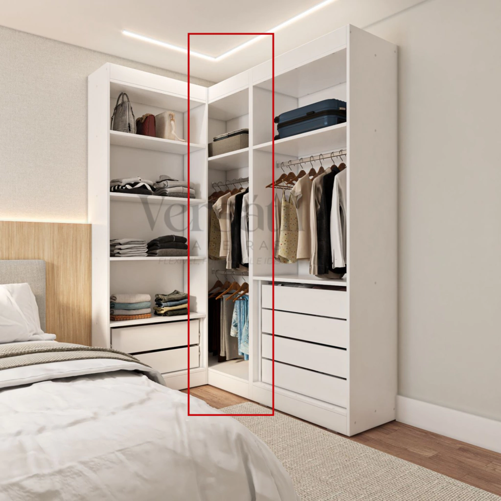 Apresentamos o Módulo Canto Cabides, ideal para quem busca otimizar espaços em L com estilo e praticidade. Com dimensões de 89 cm de comprimento, 2,20 m de altura e 45 cm de profundidade, este módulo foi projetado para oferecer dois cabideiros, proporcionando um maior espaço para suas roupas e acessórios.