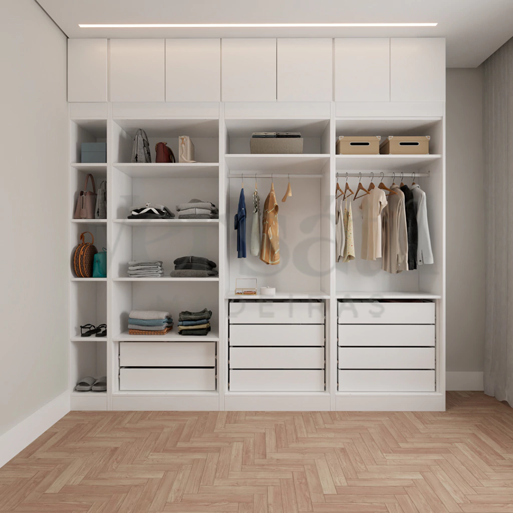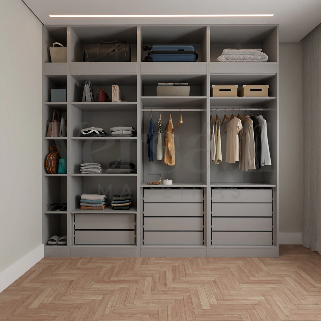 Ideal para quem busca um closet funcional e elegante, com módulos que se encaixam perfeitamente no ambiente